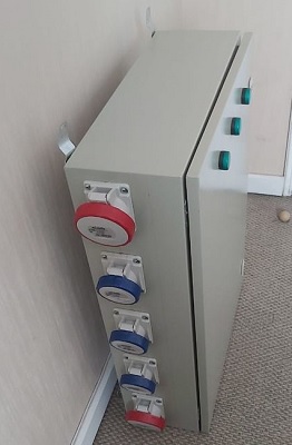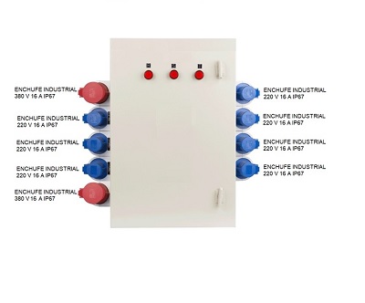 Incluye siete enchufes hembras sobrepuestas 220V 2P+T 16A y dos enchufes hembras sobrepuestas 380V 3P+T 16A